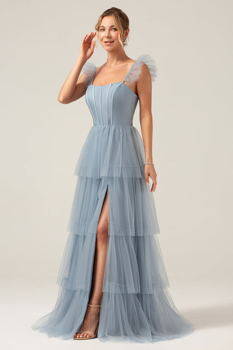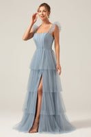 Detachable Straps A Line Purple Tiered Long Bridesmaid Dress
