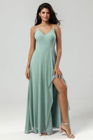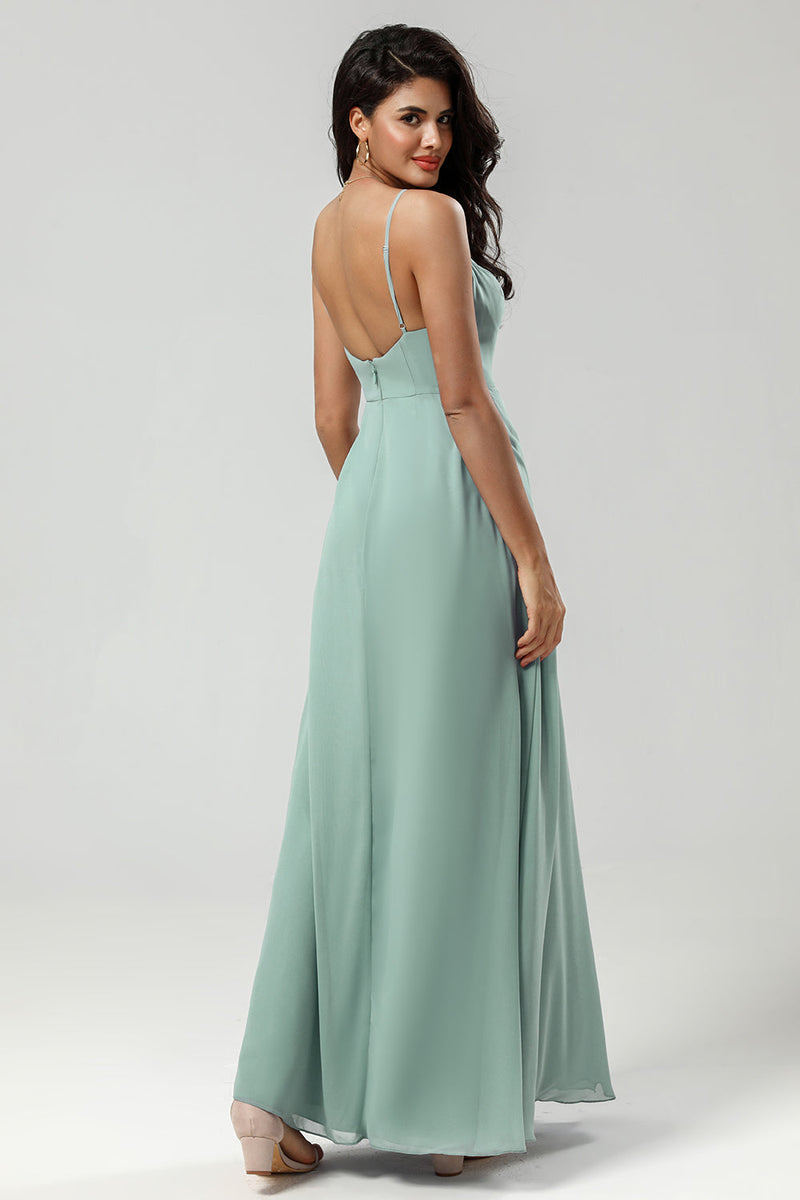 Green Spaghetti Straps Long Bridesmaid Dress with Ruffles