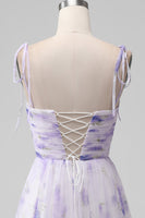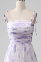 Lavender Flower Spaghetti Straps A Line Long Bridesmaid Dress with Slit