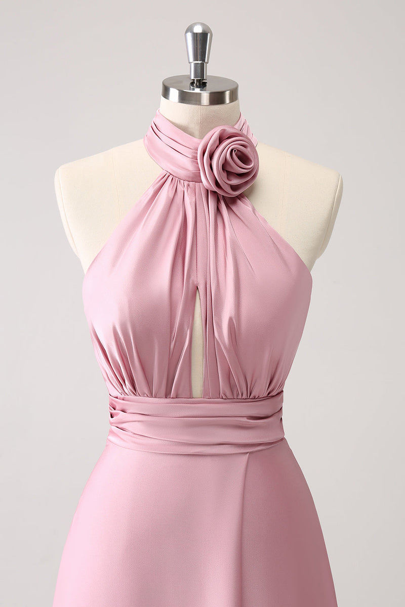 Pink Keyhole A-Line Satin Bridesmaid Dress with Slit